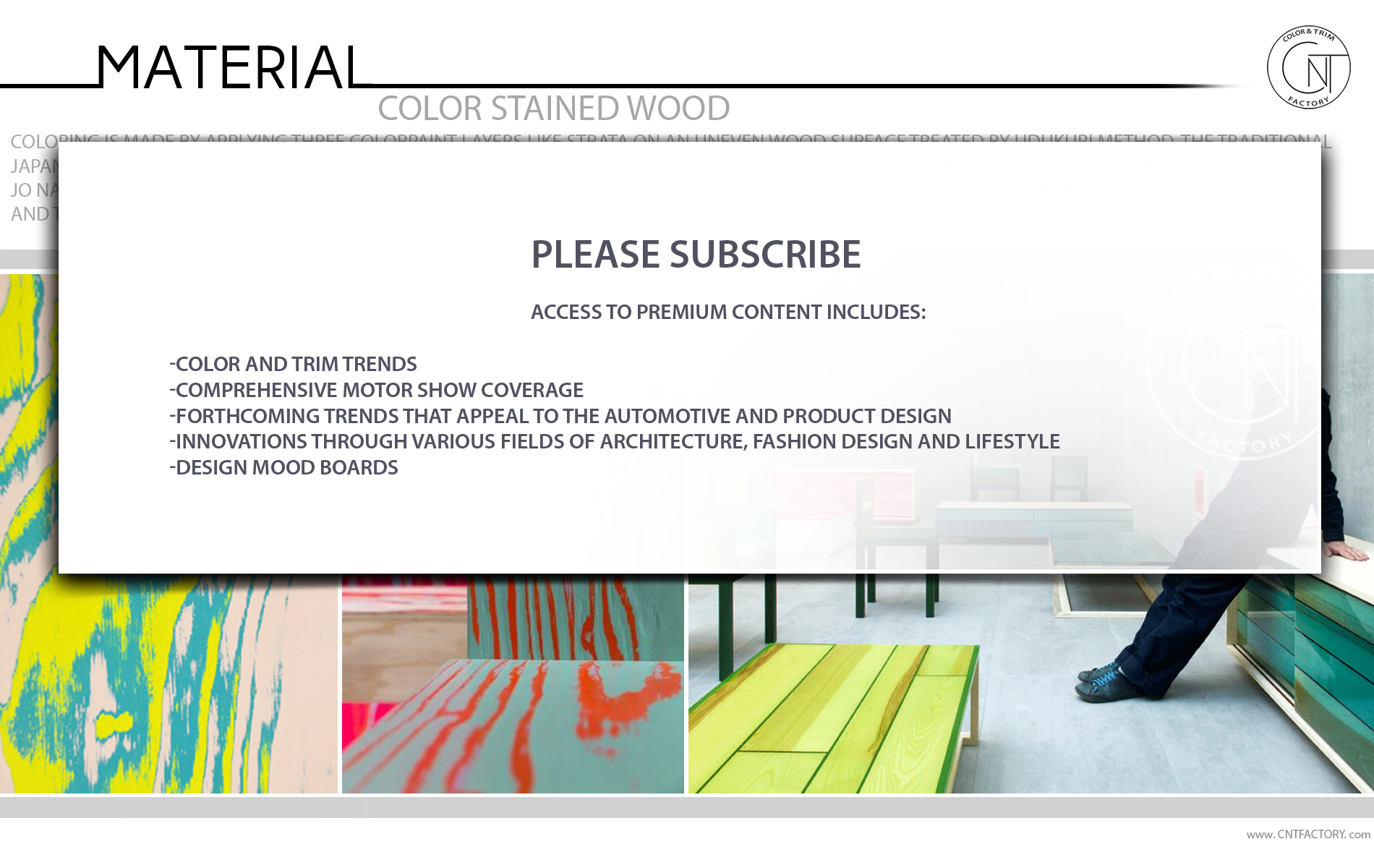 ColoRing is made by applying three colorpaint layers like strata on an uneven wood surface treated by Udukuri method, the traditional Japanese woodcraft technique; then the undulated paint surface is sanded until flat to reveal tri-colored tree ring patterns. Jo Nagasaka took inspiration from Tsugaru nuri, the traditional lacquer technique succeeded by craftsmen in Aomori, Japan, and the new method was made by integrating Tsugaru nuri and Udukuri.