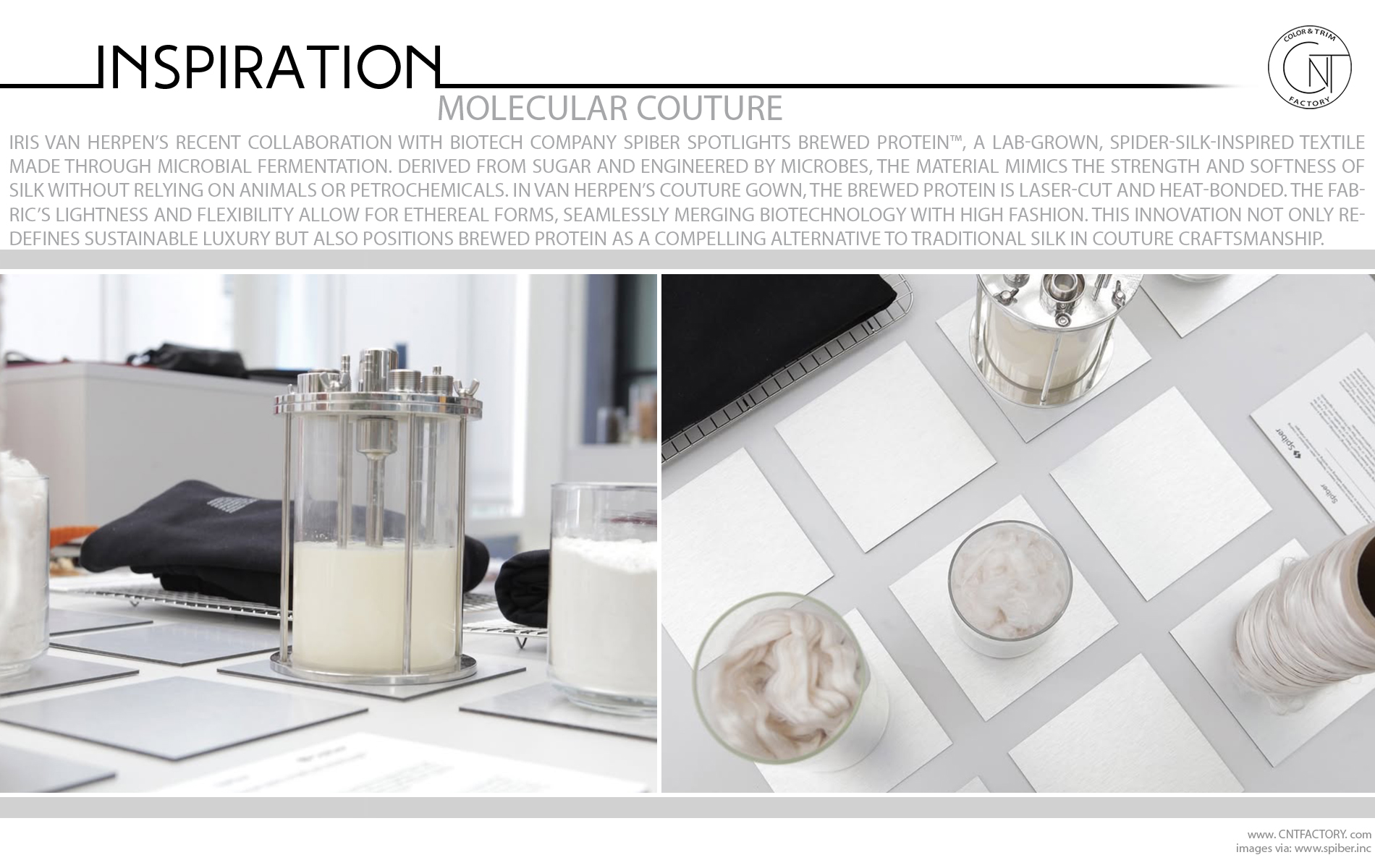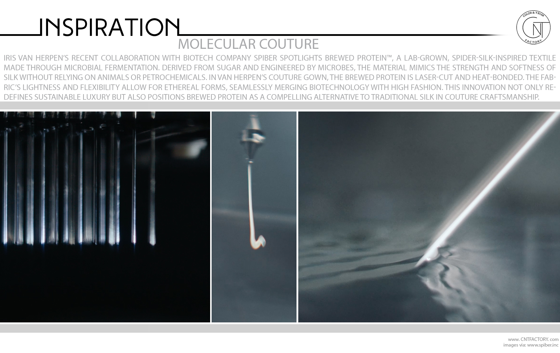 Iris van Herpen’s recent collaboration with biotech company Spiber spotlights Brewed Protein™, a lab-grown, spider-silk-inspired textile made through microbial fermentation. Derived from sugar and engineered by microbes, the material mimics the strength and softness of silk without relying on animals or petrochemicals. In van Herpen’s couture gown, the Brewed Protein is laser-cut and heat-bonded. The fabric’s lightness and flexibility allow for ethereal forms, seamlessly merging biotechnology with high fashion. This innovation not only redefines sustainable luxury but also positions Brewed Protein as a compelling alternative to traditional silk in couture craftsmanship.