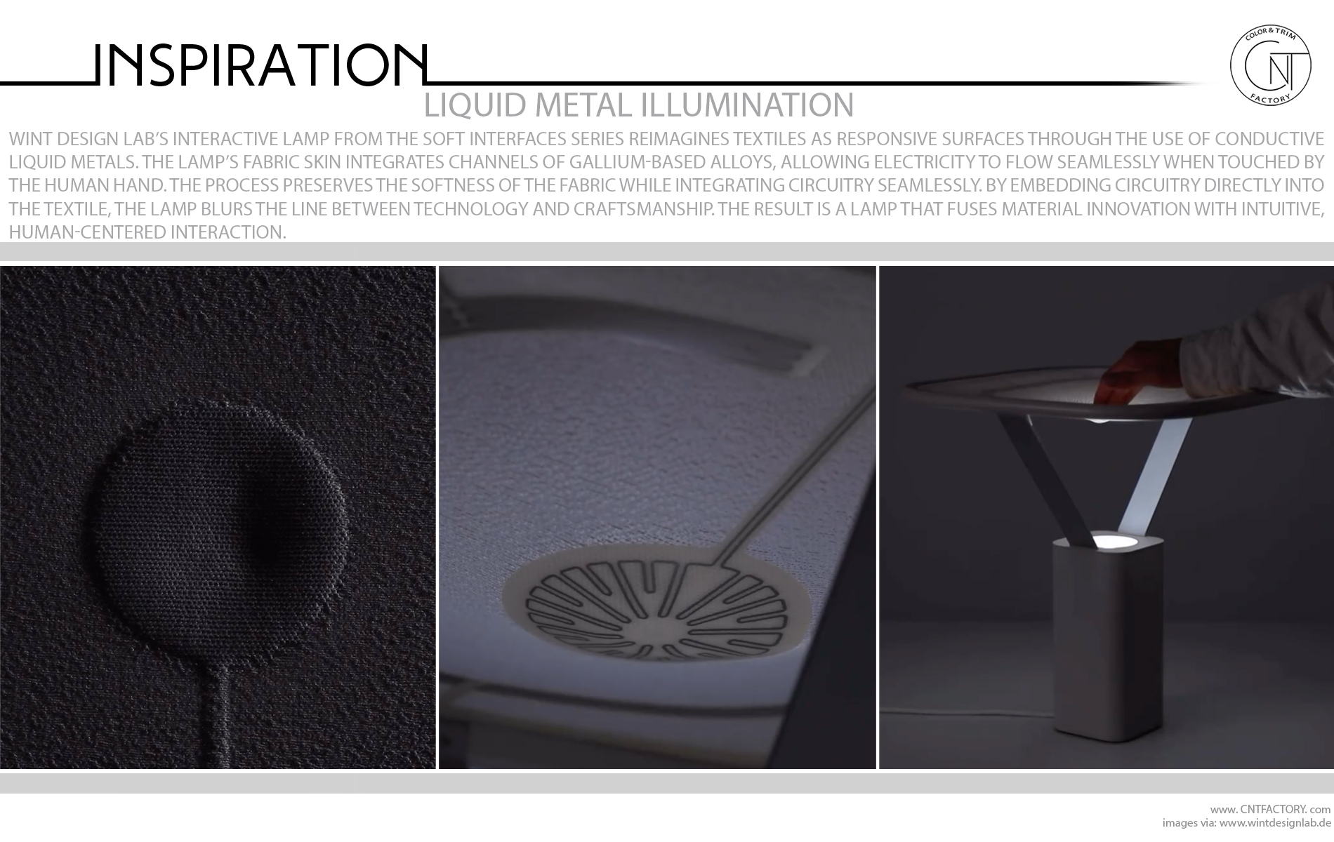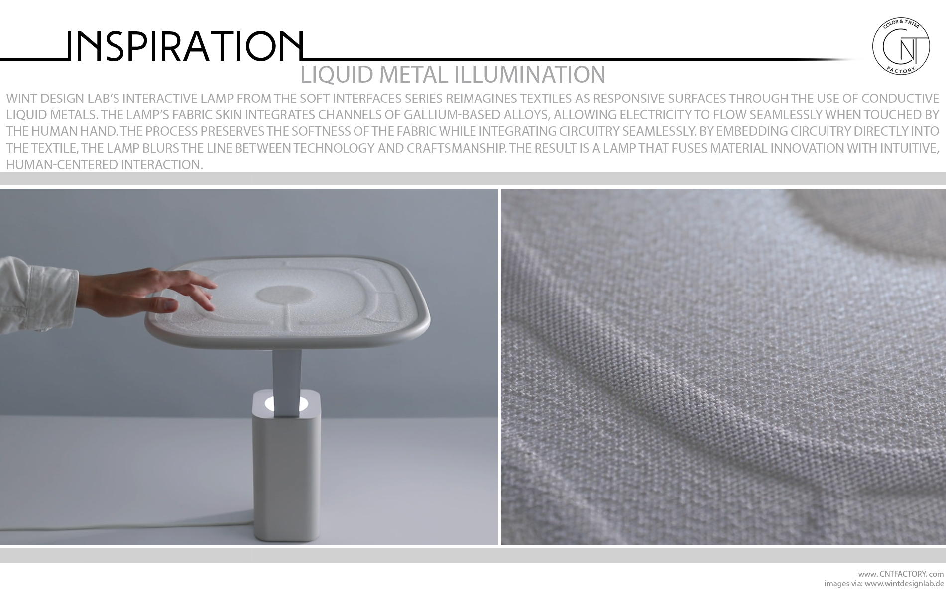 WINT Design Lab’s interactive lamp from the Soft Interfaces series reimagines textiles as responsive surfaces through the use of conductive liquid metals. The lamp’s fabric skin integrates channels of gallium-based alloys, allowing electricity to flow seamlessly when touched by the human hand. The process preserves the softness of the fabric while integrating circuitry seamlessly. By embedding circuitry directly into the textile, the lamp blurs the line between technology and craftsmanship. The result is a lamp that fuses material innovation with intuitive, human-centered interaction.
