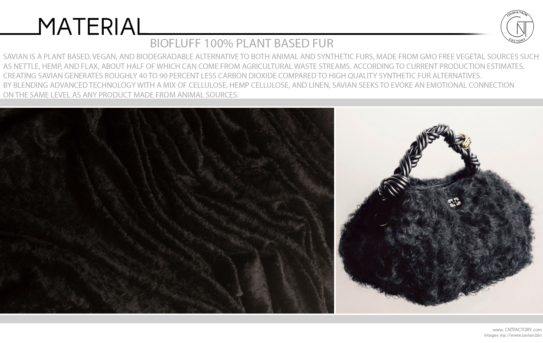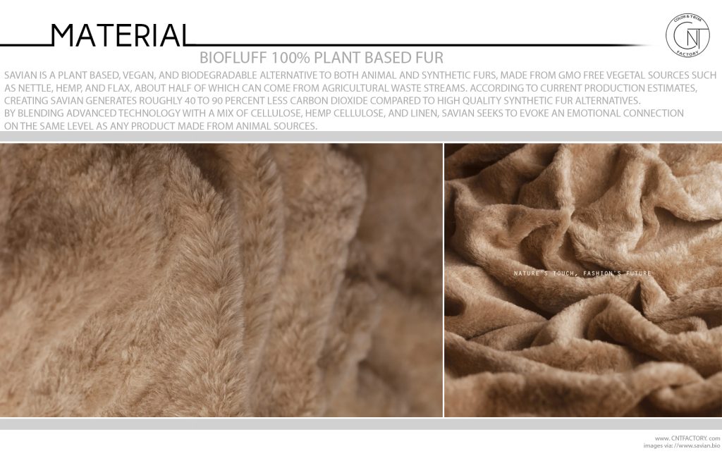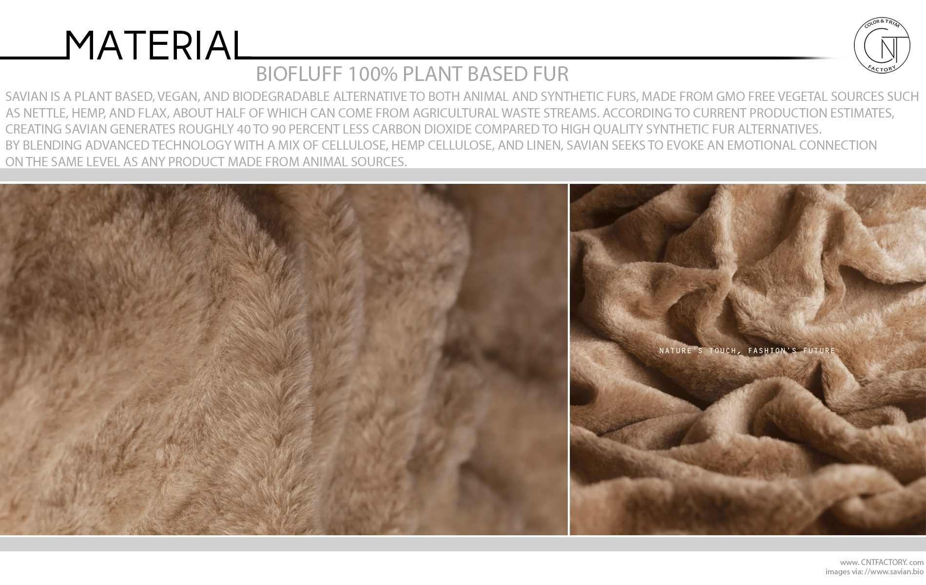 Savian is a plant based, vegan, and biodegradable alternative to both animal and synthetic furs, made from GMO free vegetal sources such as nettle, hemp, and flax, about half of which can come from agricultural waste streams. According to current production estimates, creating Savian generates roughly 40 to 90 percent less carbon dioxide compared to high quality synthetic fur alternatives.