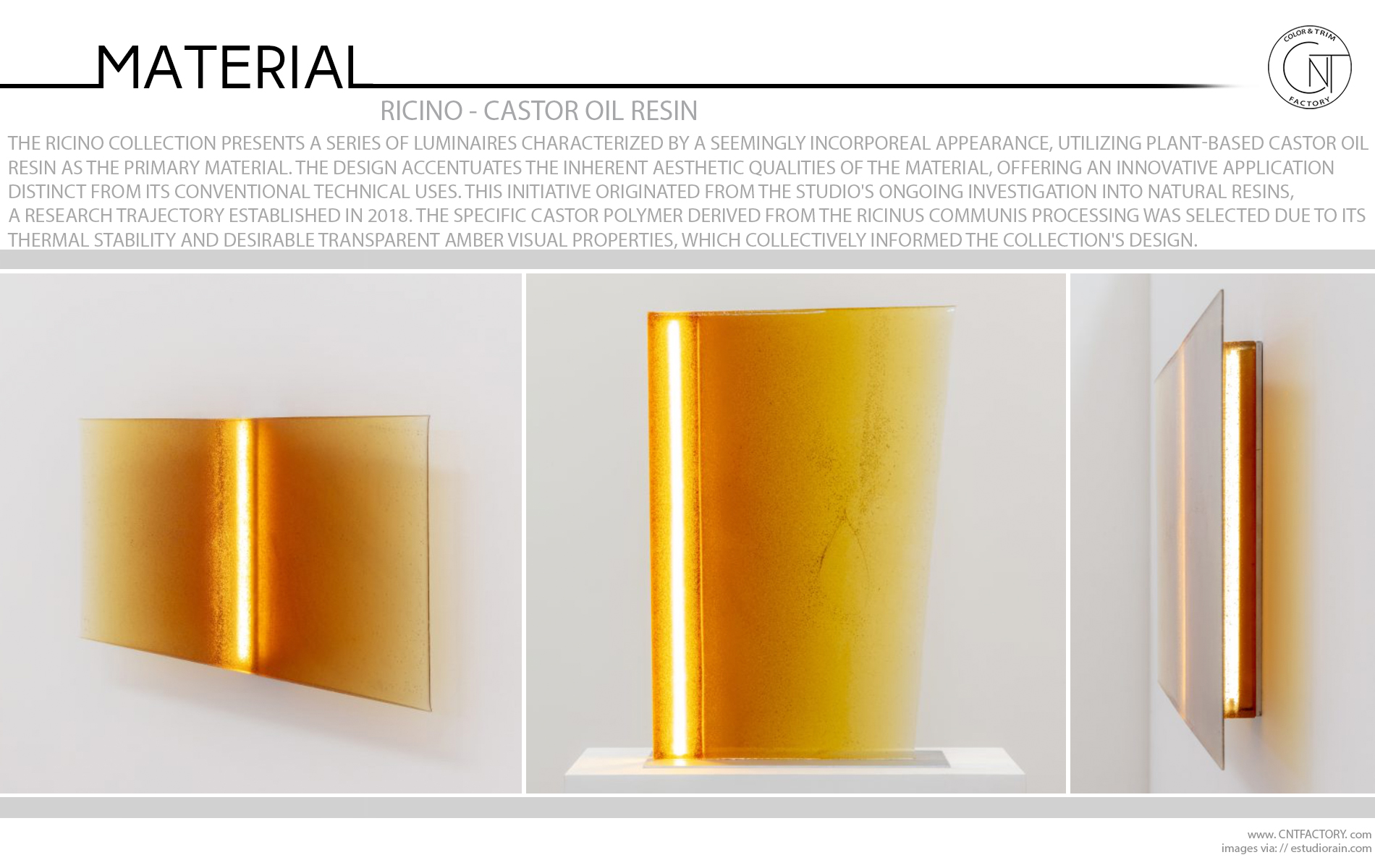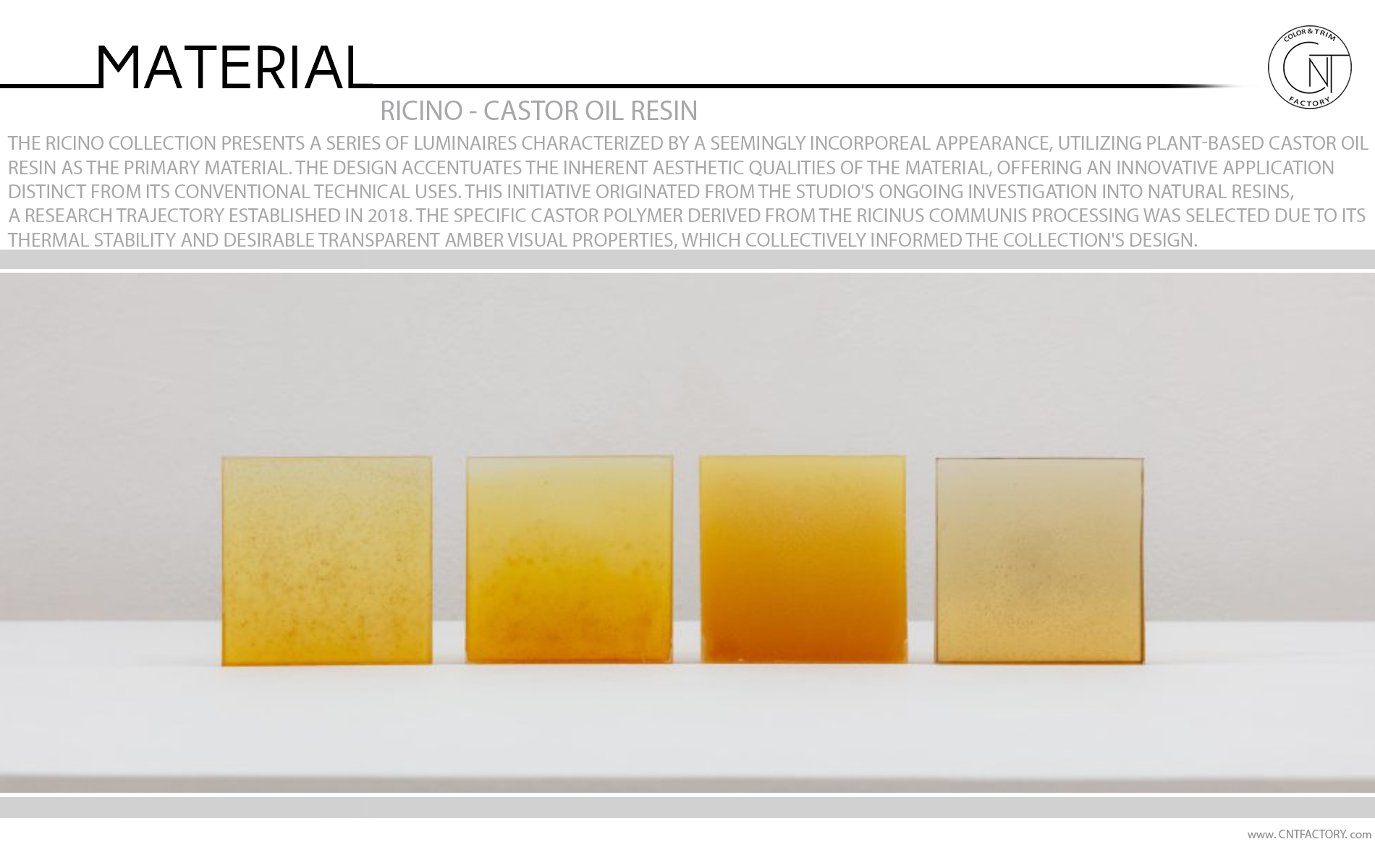 The Ricino collection presents a series of luminaires characterized by a seemingly incorporeal appearance, utilizing plant-based castor oil resin as the primary material. The design accentuates the inherent aesthetic qualities of the material, offering an innovative application distinct from its conventional technical uses. This initiative originated from the studio’s ongoing investigation into natural resins, a research trajectory established in 2018. The specific castor polymer derived from the Ricinus Communis processing was selected due to its thermal stability and desirable transparent amber visual properties, which collectively informed the collection’s design.
