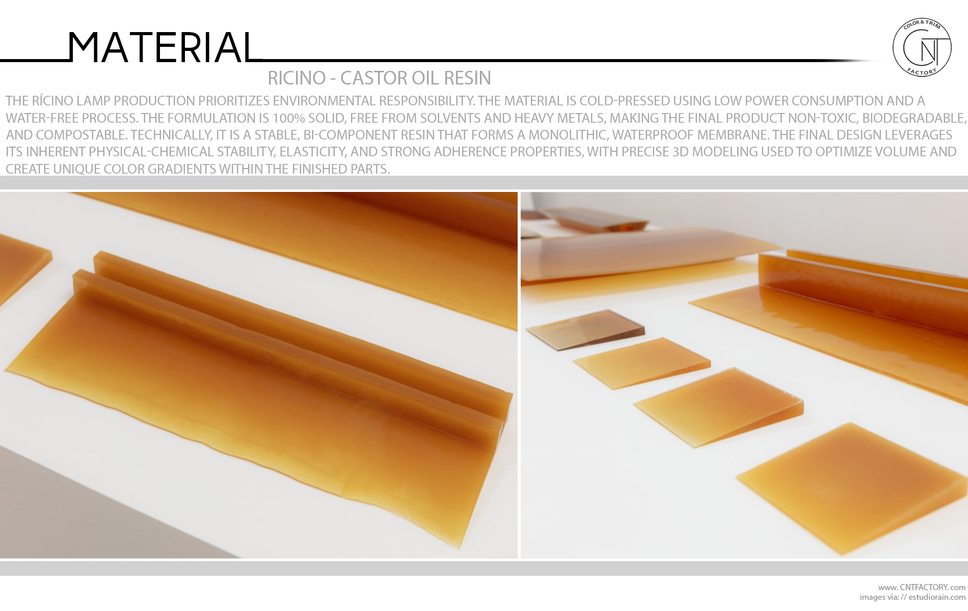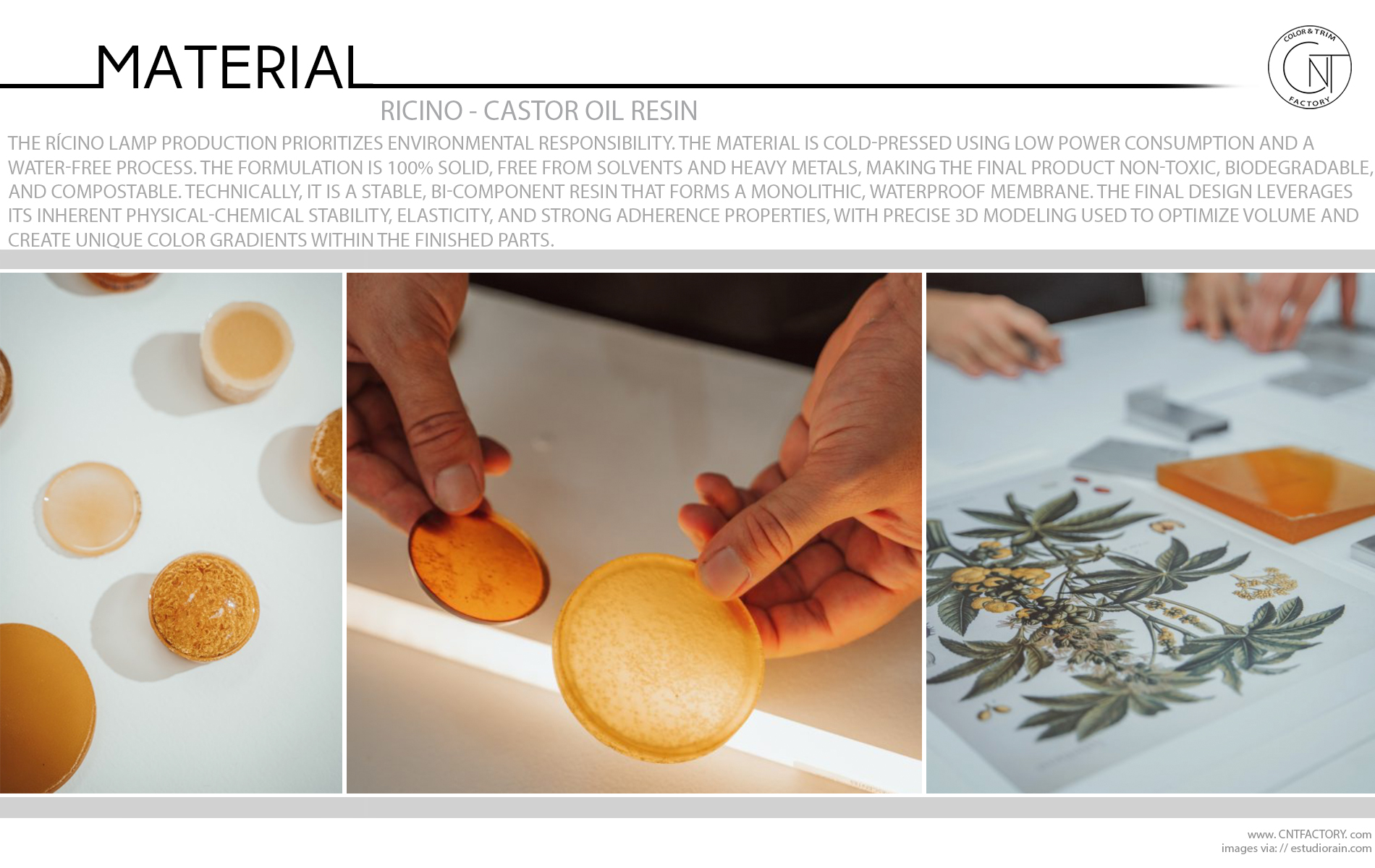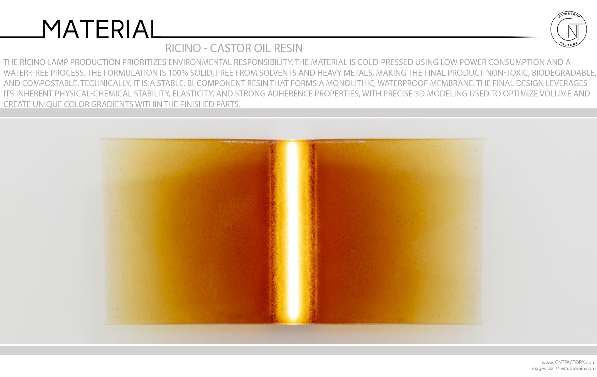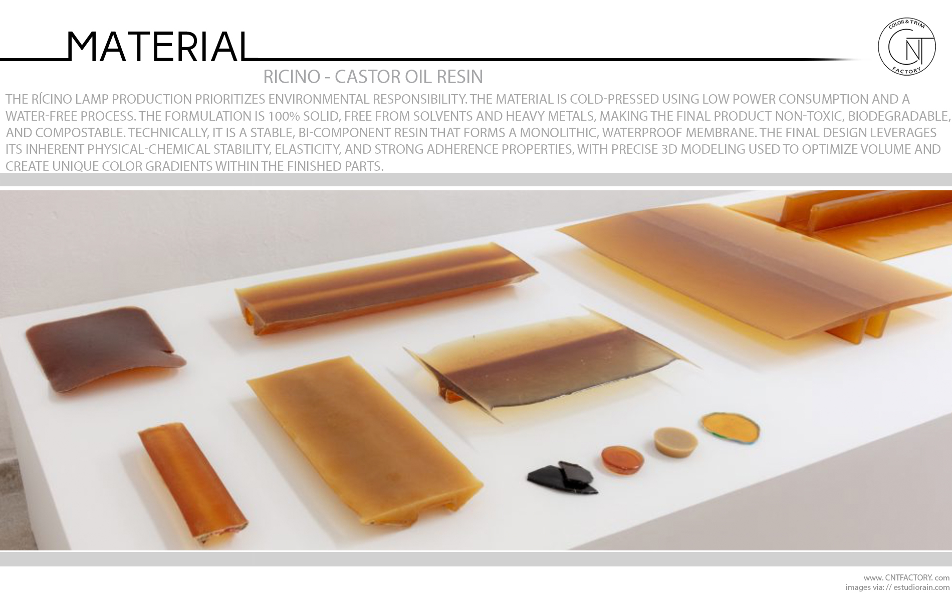 The Rícino lamp production prioritizes environmental responsibility. The material is cold-pressed using low power consumption and a water-free process. The formulation is 100% solid, free from solvents and heavy metals, making the final product non-toxic, biodegradable, and compostable. Technically, it is a stable, bi-component resin that forms a monolithic, waterproof membrane. The final design leverages its inherent physical-chemical stability, elasticity, and strong adherence properties, with precise 3D modeling used to optimize volume and create unique color gradients within the finished parts.