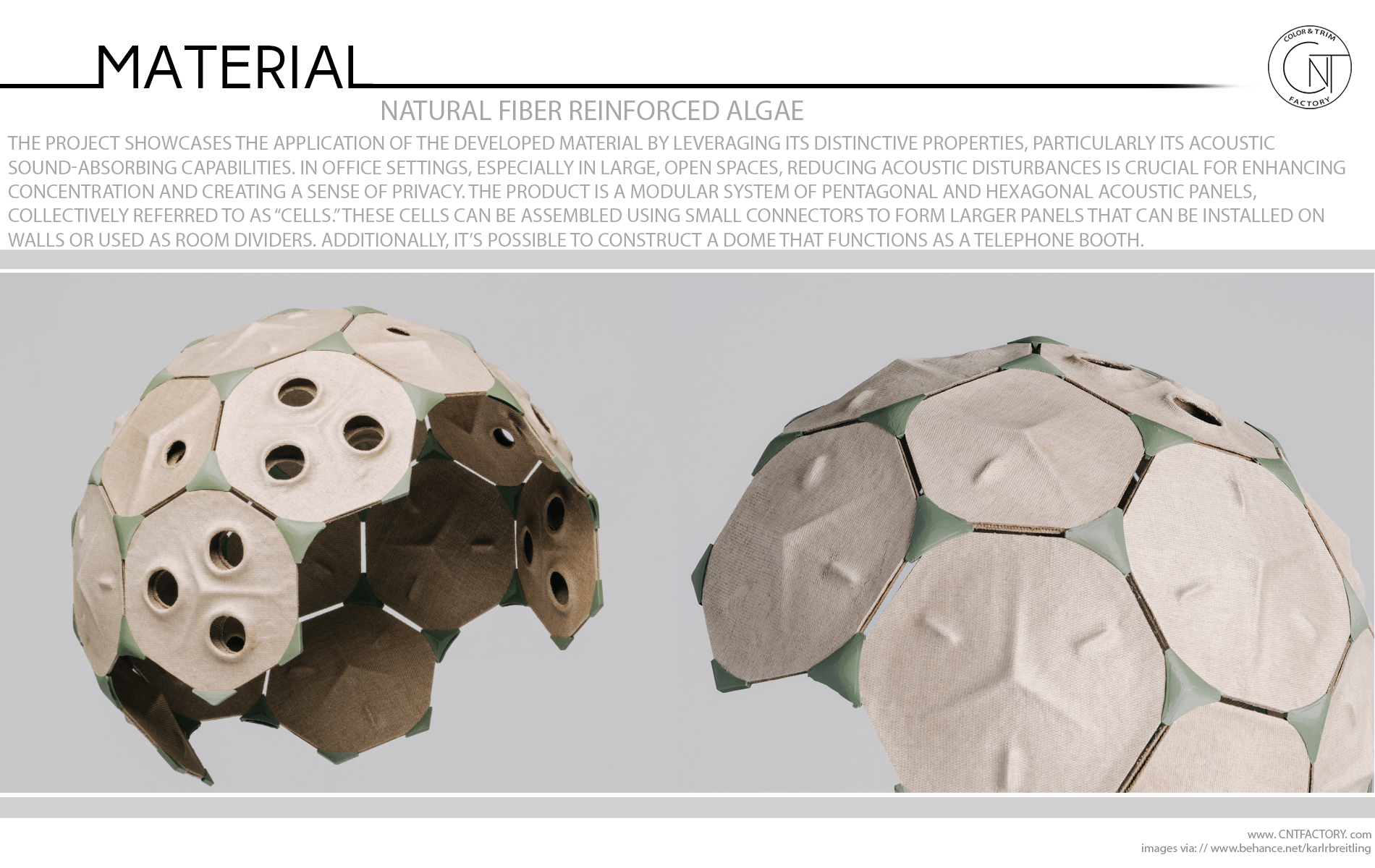 Natural fiber reinforced algae (NFA) is a materials research project by Karl Richard Breitling that aims to design a composite material entirely made of biodegradable components. Composite materials are intriguing due to their versatile properties, but they often pose challenges in recycling. Through extensive experiments with natural fibers, fabrics, and algae ingredients, Breitling has developed a material that addresses this issue while also possessing unique characteristics and aesthetics.