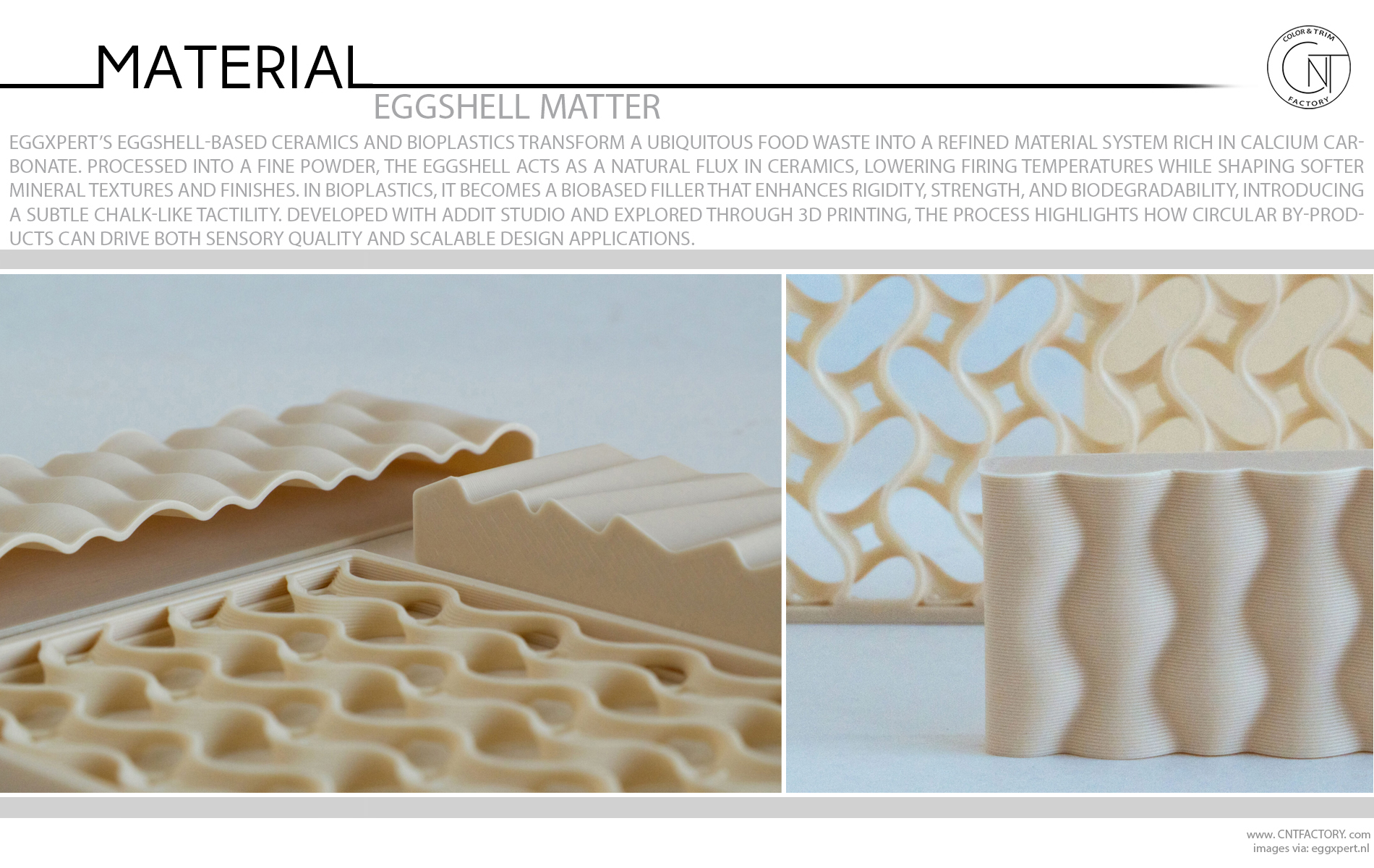 Eggxpert’s eggshell-based ceramics and bioplastics transform a ubiquitous food waste into a refined material system rich in calcium carbonate. Processed into a fine powder, the eggshell acts as a natural flux in ceramics, lowering firing temperatures while shaping softer mineral textures and finishes. In bioplastics, it becomes a biobased filler that enhances rigidity, strength, and biodegradability, introducing a subtle chalk-like tactility. Developed with Addit Studio and explored through 3D printing, the process highlights how circular by-products can drive both sensory quality and scalable design applications.