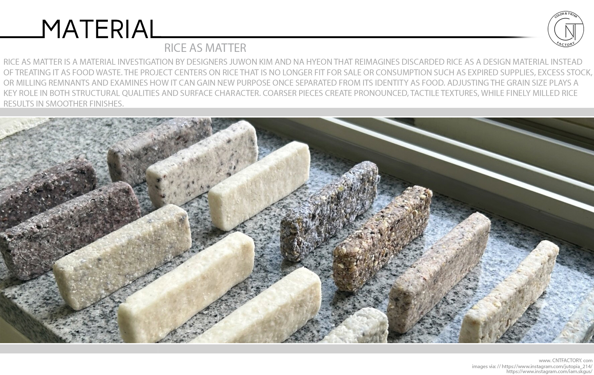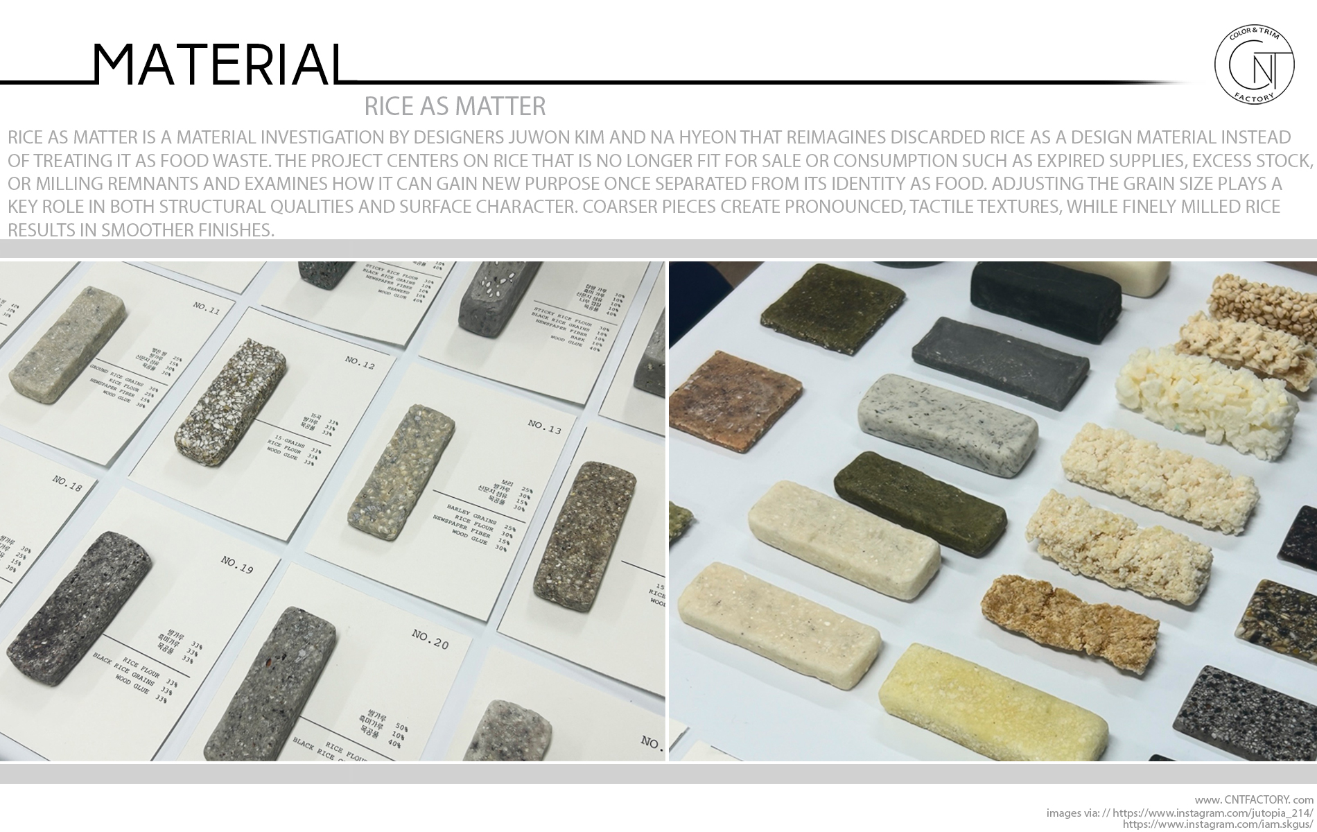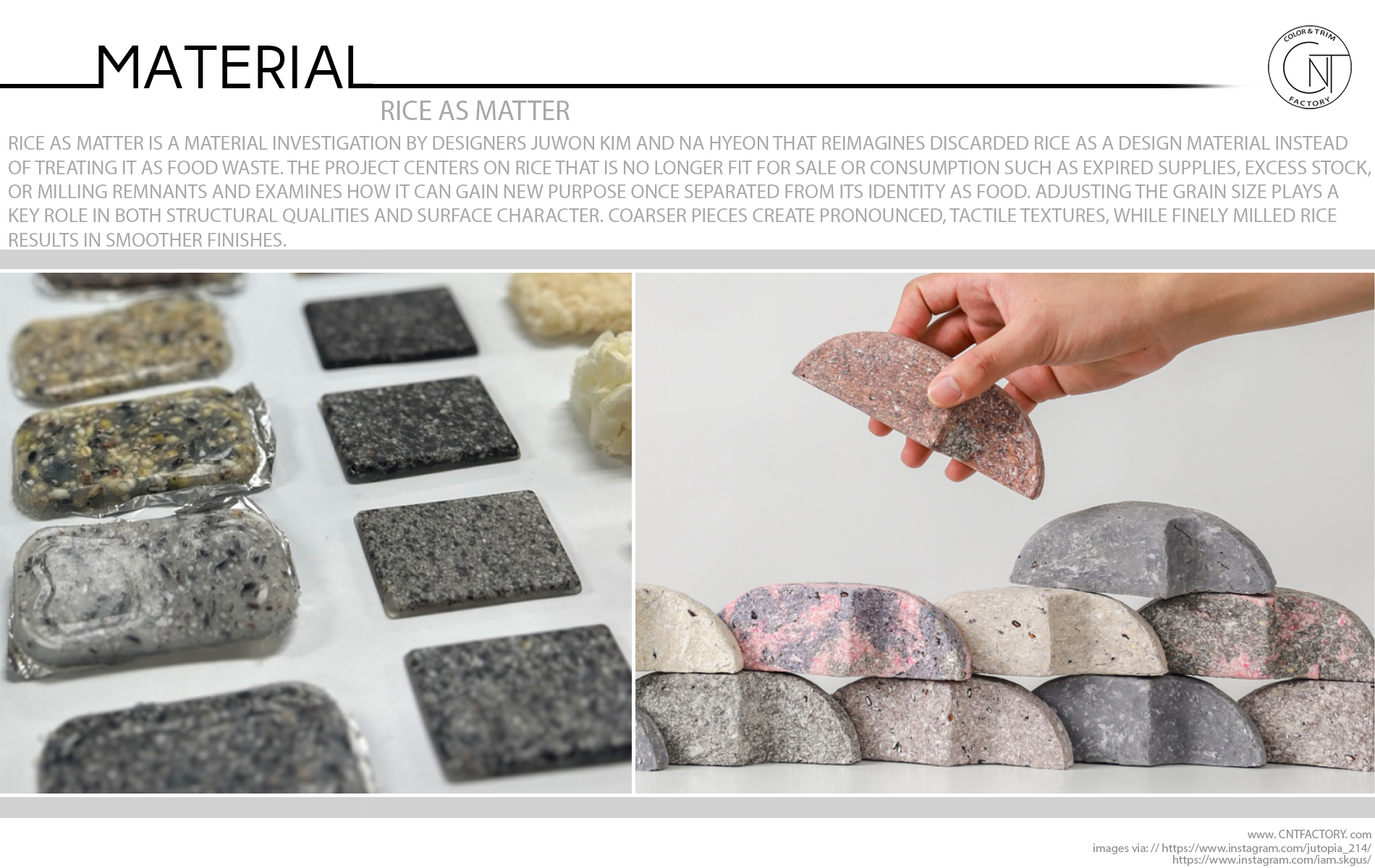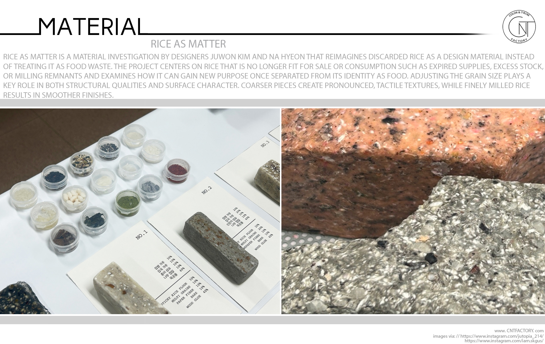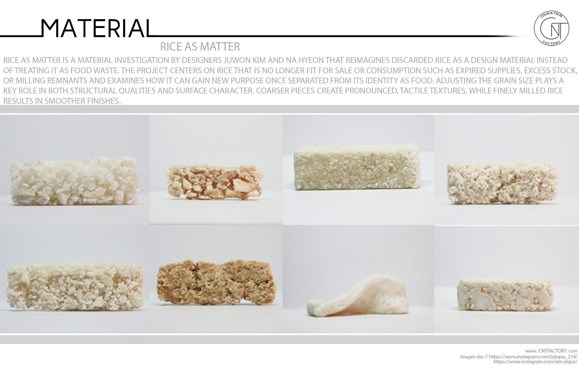 Rice as Matter is a material investigation by designers Juwon Kim and Na Hyeon that reimagines discarded rice as a design material instead of treating it as food waste. The project centers on rice that is no longer fit for sale or consumption such as expired supplies, excess stock, or milling remnants and examines how it can gain new purpose once separated from its identity as food.