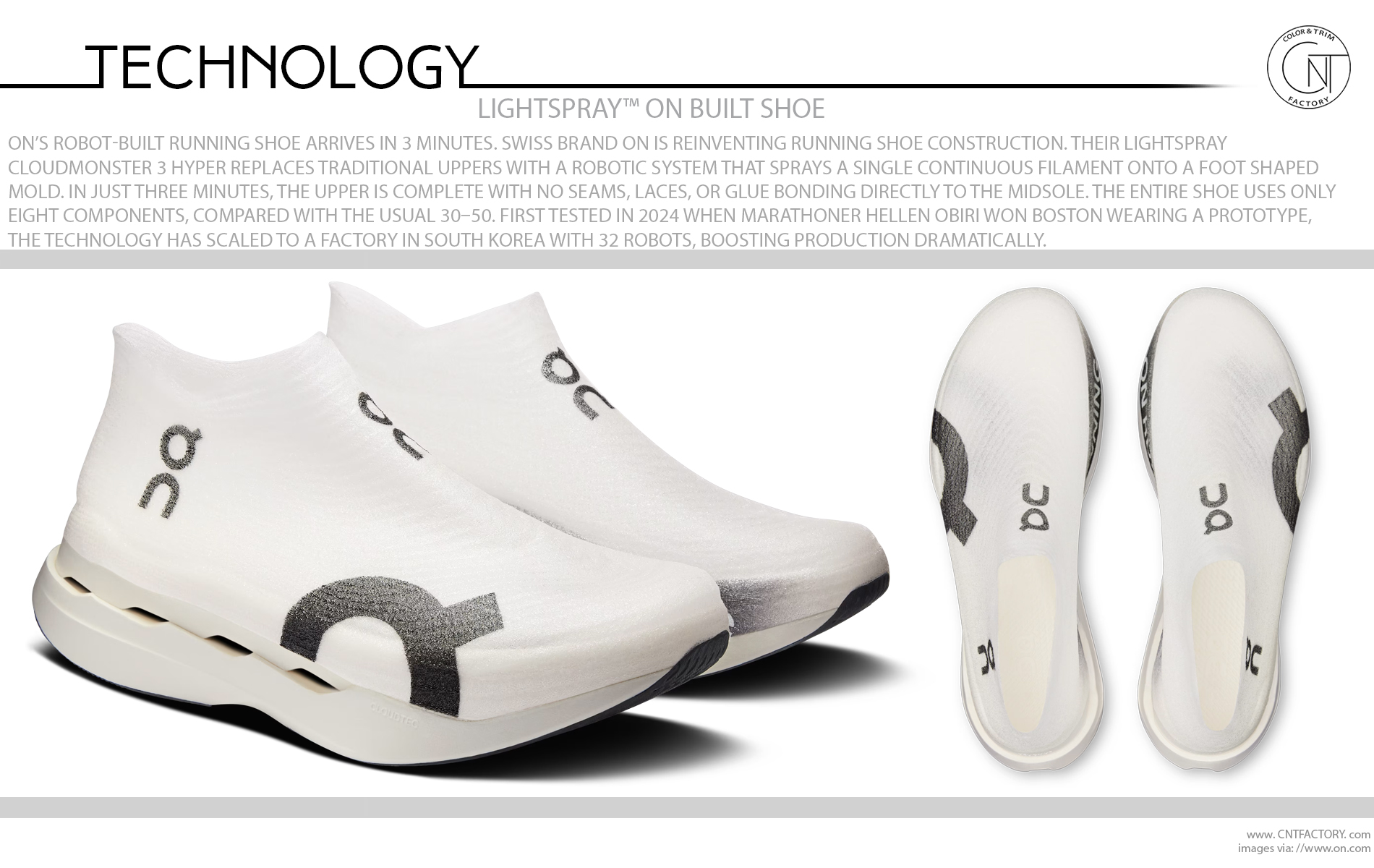 Swiss brand On is reinventing running shoe construction. Their LightSpray Cloudmonster 3 Hyper replaces traditional uppers with a robotic system that sprays a single continuous filament onto a foot shaped mold. In just three minutes, the upper is complete with no seams, laces, or glue bonding directly to the midsole. The entire shoe uses only eight components, compared with the usual 30–50.