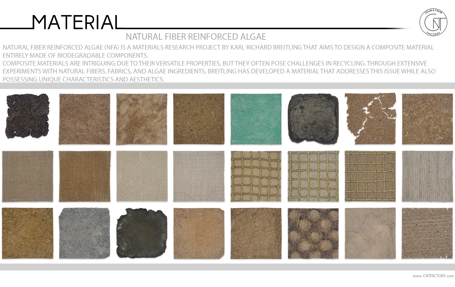 Similar Posts: Textile in Product Design / Gradient Textiles / Soft Tactile Audio Technologies Natural fiber reinforced algae (NFA) is a materials research project by Karl Richard Breitling that aims to design a composite material