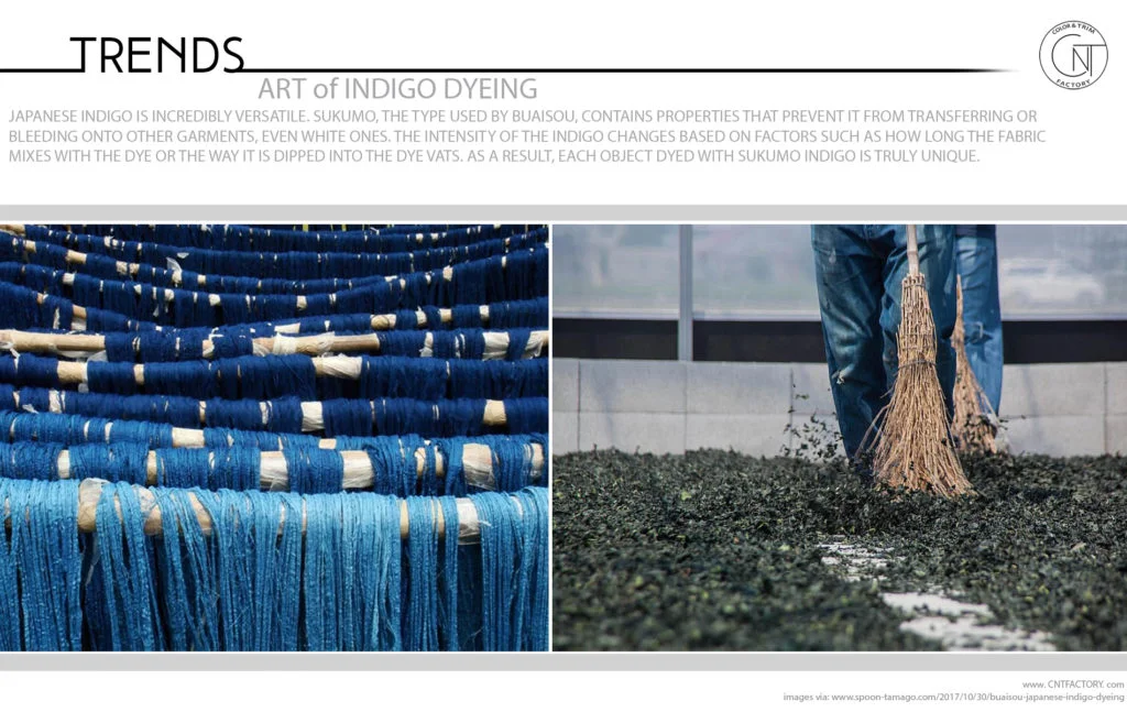 Japanese indigo is incredibly versatile. Sukumo, the type used by BUAISOU, contains properties that prevent it from transferring or bleeding onto other garments, even white ones. The intensity of the indigo changes based on factors such as how long the fabric mixes with the dye or the way it is dipped into the dye vats. As a result, each object dyed with sukumo indigo is truly unique. The dye is derived from the leaves of the Japanese indigo plant that is native to Tokushima prefecture, where BUAISOU’s farm and studio are located. Once harvested, the indigo leaves are dried and then fermented in a vat of ash lye, wheat bran, and calcium hydroxide. The indigo color is the result of oxidization when fabric is dipped into the dye and exposed to the air.