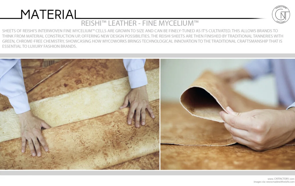 Sheets of Reishi's interwoven Fine Mycelium™ cells are grown to size and can be finely-tuned as it's cultivated. This allows brands to think from material construction up, offering new design possibilities. The Reishi sheets are then finished by traditional tanneries with green, chrome-free chemistry, showcasing how MycoWorks brings technological innovation to the traditional craftsmanship that is essential to luxury fashion brands.