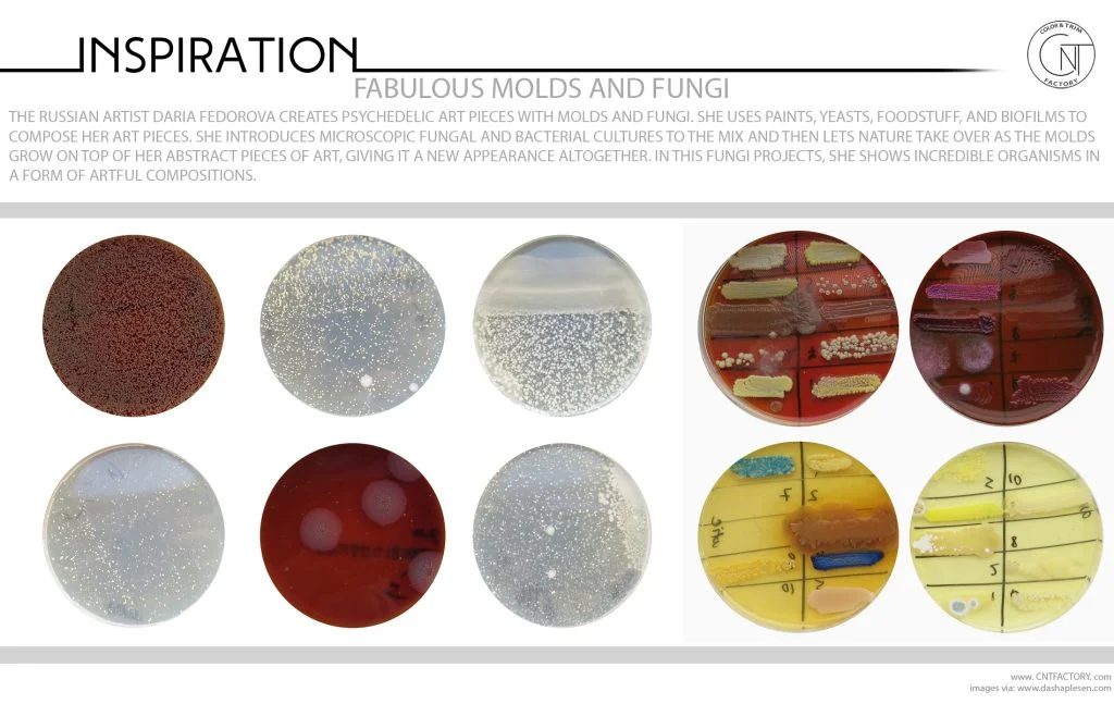 The Russian artist Daria Fedorova creates psychedelic art pieces with molds and fungi. She uses paints, yeasts, foodstuff, and biofilms to compose her art pieces. She introduces microscopic fungal and bacterial cultures to the mix and then lets nature take over as the molds grow on top of her abstract pieces of art, giving it a new appearance altogether. In this Fungi projects, she shows incredible organisms in a form of artful compositions.