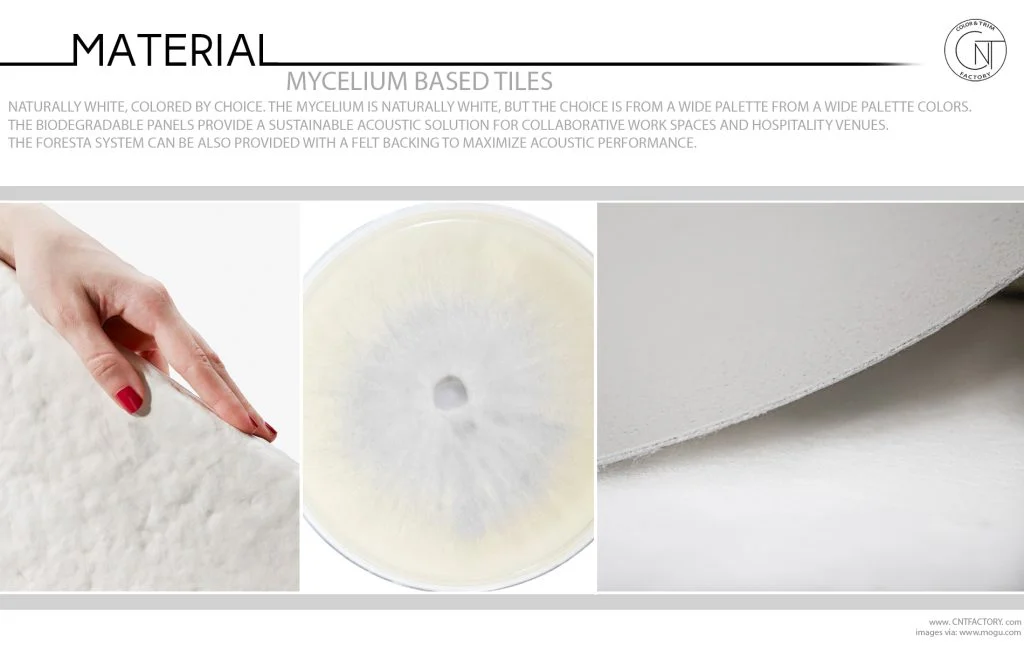 Naturally white, colored by choice.The mycelium is naturally white, but the choice is from a wide palette colors. The biodegradable panels provide a sustainable acoustic solution for collaborative work spaces and hospitality venues. The Foresta system can be also provided with a felt backing to maximize acoustic performance.