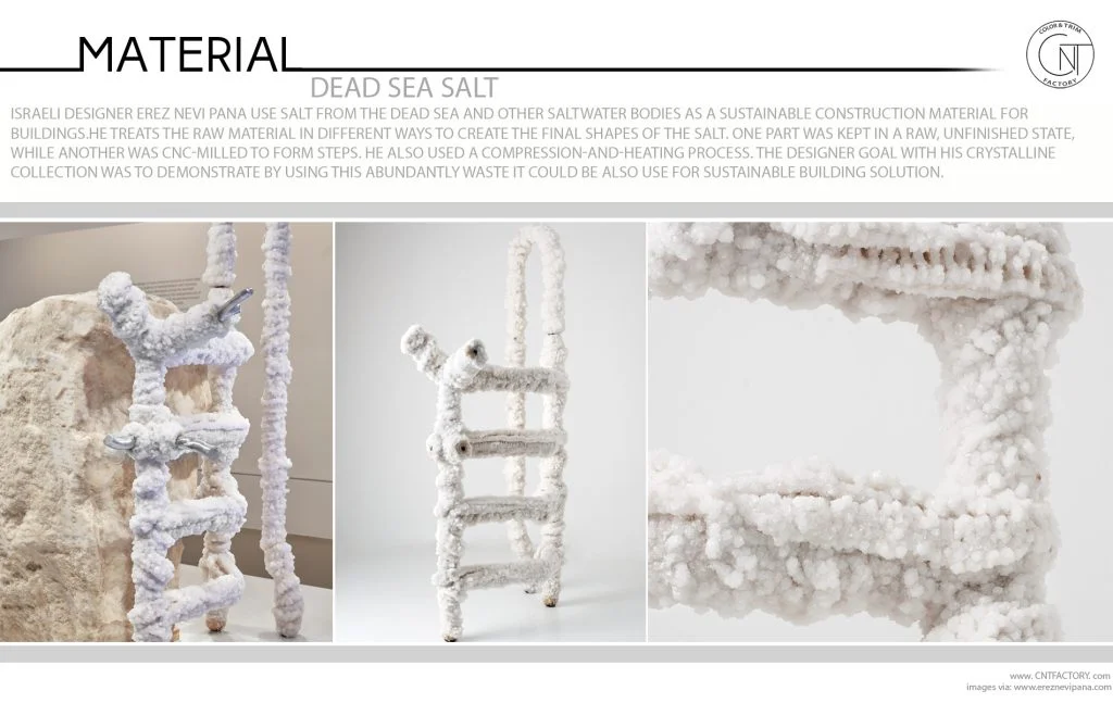 Israeli designer Erez Nevi Pana use salt from the dead sea and other saltwater bodies as a sustainable construction material for buildings.He treats the raw material in different ways to create the final shapes of the salt. One part was kept in a raw, unfinished state, while another was CNC-milled to form steps. He also used a compression-and-heating process. The designer goal with his Crystalline collection was to demonstrate by using this abundantly waste it could be also use for sustainable building solution.