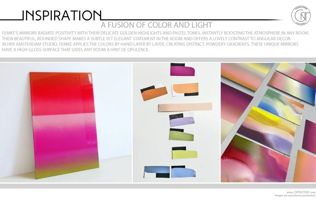 In her Amsterdam studio, Femke applies the colors by hand layer by layer, creating distinct, powdery gradients. These unique mirrors have a high-gloss surface that gives any room a hint of opulence.